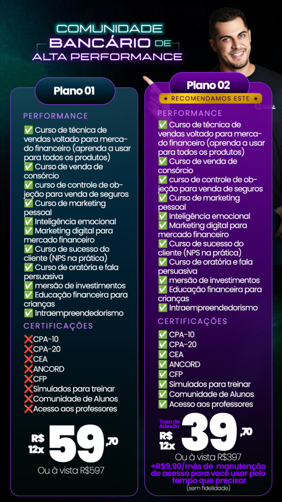 Formação completa que vai te preparar para atuar em alto nível dentro do banco: promoções, reconhecimento e você sabendo o que fazer. Você pode estar há um degrau do seu próximo cargo dentro do banco!